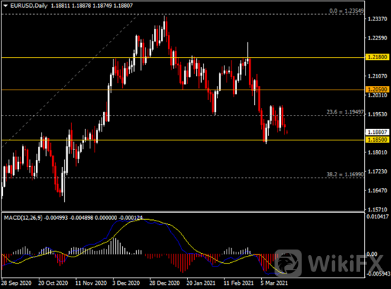 日线图显示欧元兑美元震荡下行,当前承压于1.1950阻力。从MACD来看,快慢线收窄,白色动能柱收缩殆尽。汇价走势和动能柱的变化呈分歧。