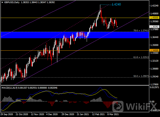 日线图显示英镑兑美元震荡下挫,当前承压于1.4000阻力。从MACD来看,快慢线拐向下行,红色动能柱恢复放量。汇价走势基本和动能柱的变化一致。