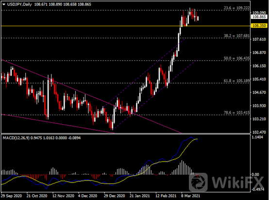 日线图显示美元兑日元高位回调,当前承压于109.20阻力。从MACD来看,快慢线形成死叉,红色动能柱温和增量。汇价走势基本和动能柱的变化一致。