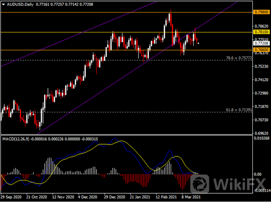 日线图显示澳元兑美元温和下行,当前承压于趋势线阻力和0.7810阻力。从MACD来看,快慢线收窄,白色动能柱收缩殆尽。汇价走势基本和动能柱的变化一致。