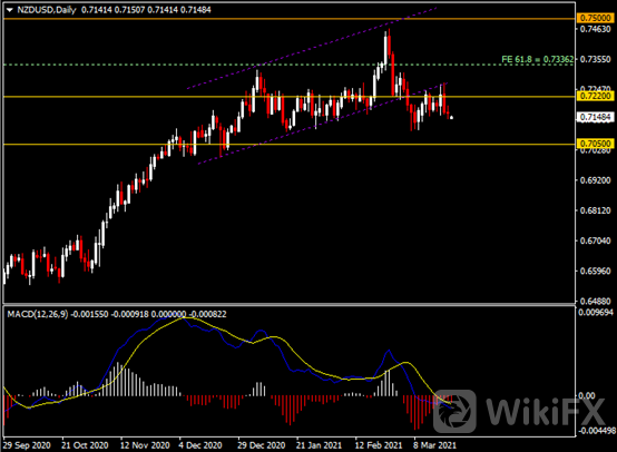 日线图显示纽元兑美元遇阻回落,当前承压于0.7220阻力。从MACD来看,快慢线向下运行,红色动能柱恢复增量。汇价走势基本和动能柱的变化一致。