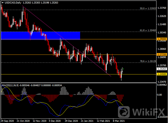 日线图显示美元兑加元反弹收涨于1.2450支撑。从MACD来看,快慢线呈拐向,红色动能柱温和收缩。汇价走势基本和动能柱的变化一致。