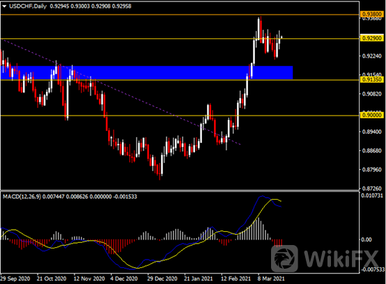 日线图显示美元兑瑞郎持续走高,当前测试0.9290阻力。从MACD来看,快慢线死叉依旧,红色动能柱则稍有收敛。汇价走势基本和动能柱的变化一致。