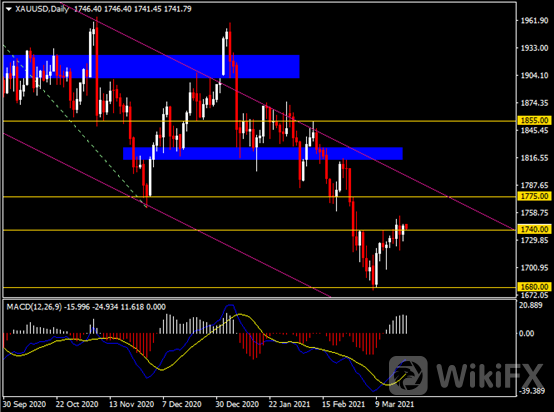 日线图显示金价温和上行,当前测试1740阻力。从MACD来看,快慢线向上运行,白色动能柱稍显收敛。金价走势和动能柱的变化呈分歧。
