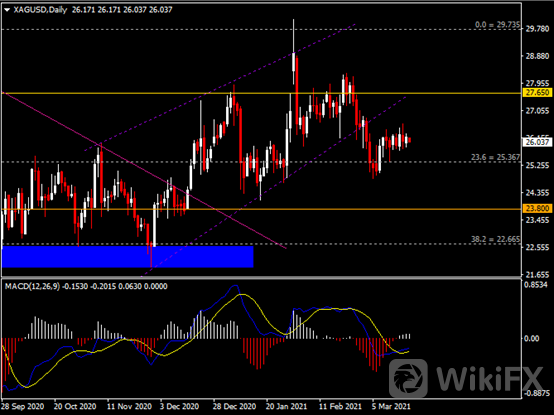 日线图显示银价区间窄幅震荡,当前收于25.35支撑。从MACD来看,快慢线金叉依旧,白色动能柱显示银价动能有限。银价走势基本和动能柱的变化一致。