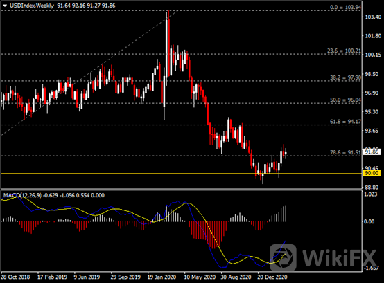 周线图显示美元指数企稳反弹,当前收于91.50支撑。从MACD来看,快慢线向上扩张,白色动能柱持续放量。指数走势基本和动能柱的变化一致。