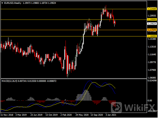 周线图显示欧元兑美元回调走弱,当前承压于1.2000阻力。 从MACD来看,快慢线向下运行,红色动能柱放量。汇价走势基本和动能柱的变化一致。