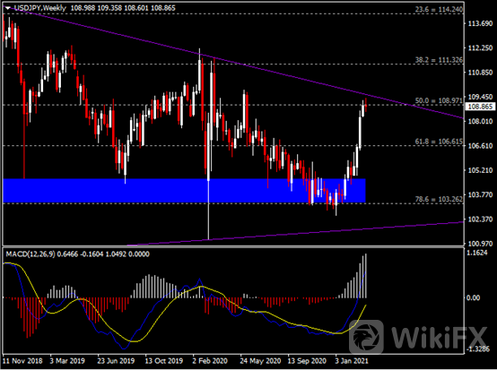 (美元兑日元周线图 来源:HotForex)