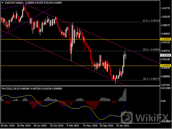 周线图显示美元兑瑞郎多头企稳,当前仍承压于0.9365阻力。 从MACD来看, 快慢线向上扩张,白色动能柱放量。汇价走势和动能柱的变化稍显分歧。