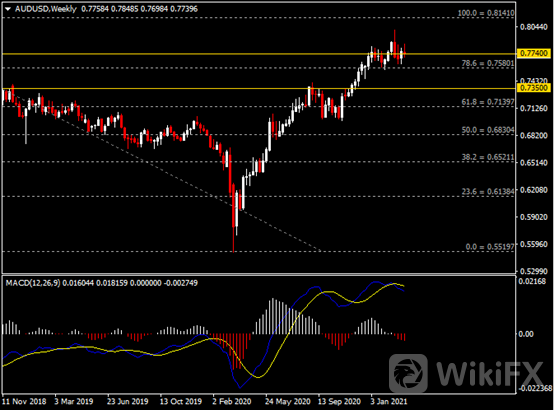 周线图显示澳元兑美元温和收低,当前测试0.7740支撑。 从MACD来看,快慢线死叉依旧,红色动能柱温和增量。汇价走势基本和动能柱的变化一致。