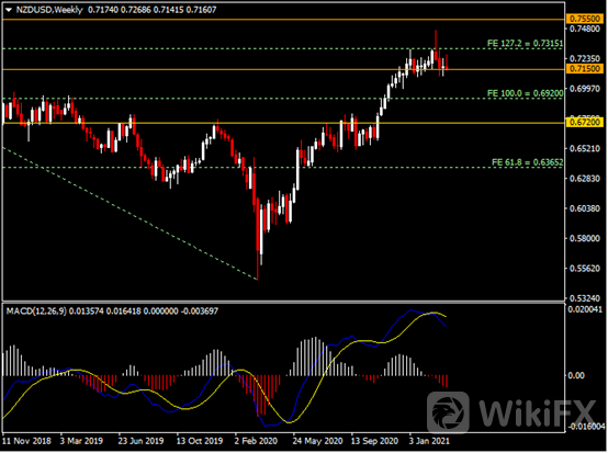 周线图显示纽元兑美元高位回落,当前回测0.7150区间支撑。从MACD来看,快慢线向下运行,红色动能柱温和放量。汇价走势基本和动能柱的变化一致。