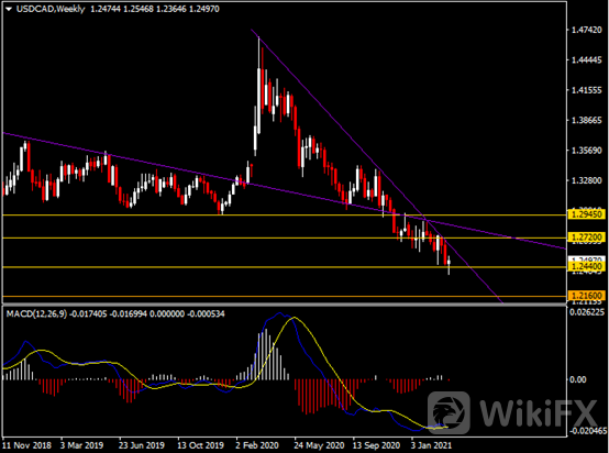 周线图显示美元兑加元先跌后涨,当前收于1.2440支撑。从MACD来看,快慢线形成死叉,白色动能柱收缩殆尽。汇价走势和动能柱的变化呈分歧。