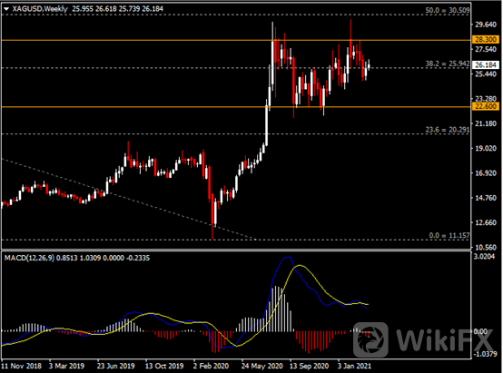 周线图显示银价收复部分跌势,当前回测25.95阻力。从MACD来看,快慢线死叉依旧,红色动能柱温和放量。银价走势和动能柱的变化呈分歧。