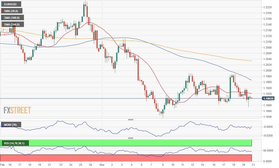 在欧元/美元一直交易略高于1.1885,约为61.8%回撤位。风险偏向下行,因为在日线图中,20 SMA维持其看跌斜率低于100 SMA并高于当前水平。技术指标在负水平内仍然没有方向。在4小时图中,该货币对在其所有移动均线下方发展,无方向20 SMA在1.1925提供阻力。技术指标缺乏方向性,中线附近缺乏动能,RSI为44。