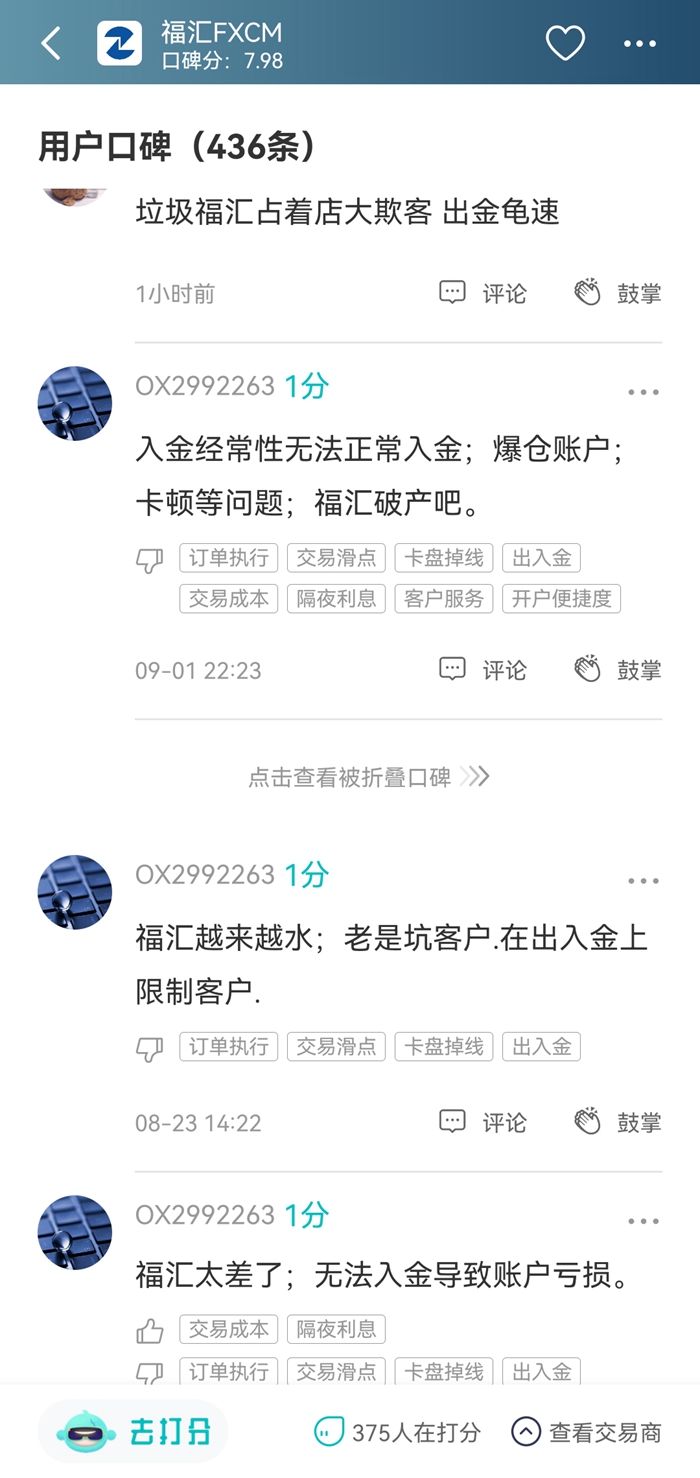 口碑方面,福汇FXCM目前在天网查的口碑分为7.99,用户评论不好不坏。不过,从去年年底到目前,我们收到的其低分评论比较多,不少用户认为平台存在滑点、出金慢的问题。