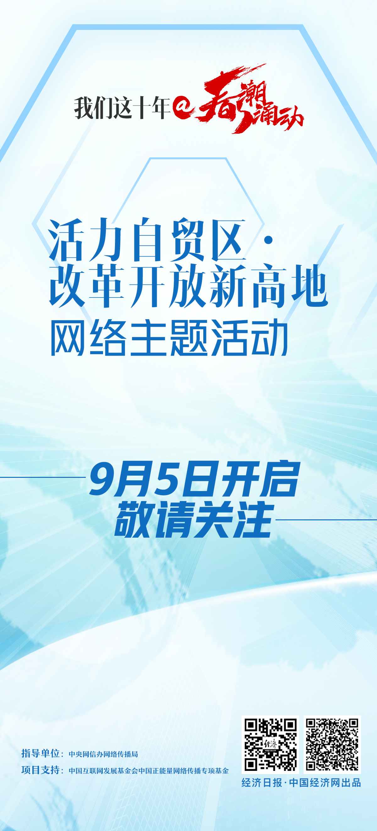 中国经济网9月5日讯 9月5日,“活力自贸区·改革开放新高地”网络主题活动将开启。活动将创新运用全媒体手段,全面、立体展开报道。旨在宣传好新发展格局下21个自贸区正在焕发的新光彩,展现在加快建设实体经济、对外开放、科技创新、制度创新等方面取得的新发展成果和活力。