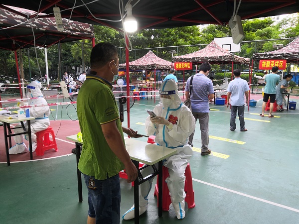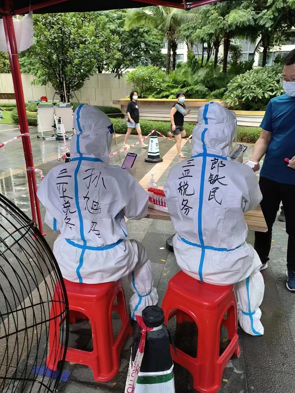 郎铁民在卓达社区核酸检测点担任信息采集员,始终坚守在“水深火热”的工作中:在暑气蒸腾的夏日,热汗把防护服黏在身上,经过一上午阳光的炙烤,他的背上起了不少又疼又痒的疹子,一流汗就像在伤口上撒盐,但他始终咬紧牙关坚持工作;台风“木兰”过境时风雨交加,瓢泼大雨把他从头到脚淋了个遍,眼镜上也挂满水汽看不清东西,但他不叫苦、不叫累,依然耐心细致地坚守在岗位上。