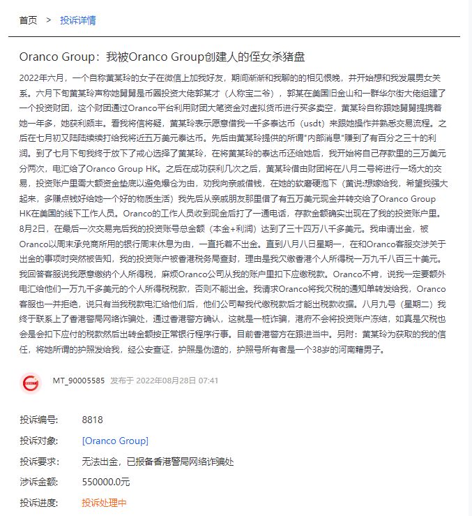 最近关于Oranco Group投诉曝光很多,请各位投资者务必警惕这个黑平台。