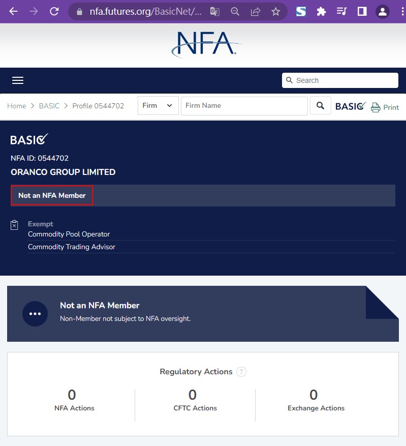 Oranco Group在官网宣称ORANCO GROUP LIMITED受美国NFA(监管号0544702)监管和美国FinCEN(号31000204180626)监管。