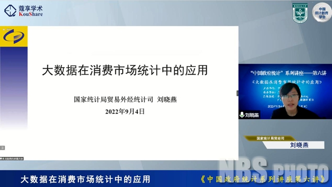 2022年9月4日,中国统计教育学会以在线直播方式举办了“中国政府统计”系列讲座第六讲。国家统计局贸易外经司消费监测处处长刘晓燕以“大数据在消费市场统计中的应用”为题授课,中国统计教育学会副秘书长、成都信息工程大学统计学院院长李勇主持讲座。