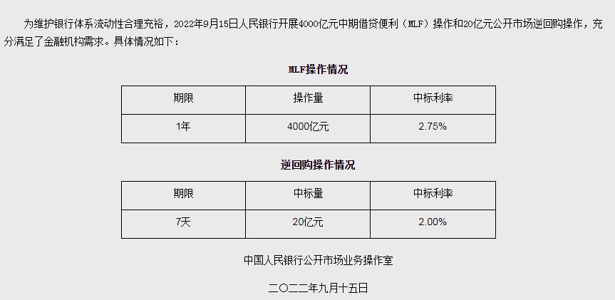 央行公告称,为维护银行体系流动性合理充裕,9月15日人民银行开展4,000亿元中期借贷便利(MLF)操作和20亿元公开市场逆回购操作,充分满足了金融机构需求。