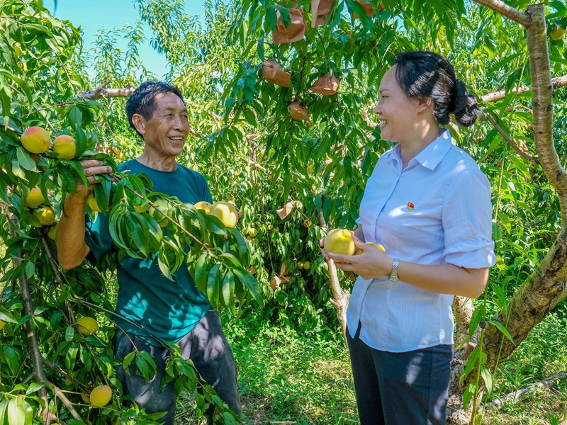 为夯实乡村振兴的产业基础,中国银行湖南省分行加大对大型粮商、地方农垦企业的金融支持,针对各地特色产业,按照“一县一特、一特一片”思路创新专属金融产品,支持优质农产品精深加工及冷链物流等客户开展产业链整合,支持农业产业化龙头企业及联合体发展,延伸农业产业链,推动农村一二三产业融合发展。截至2022年8月末,该行涉农贷款同比增速超50%。图为该行工作人员在衡阳祁东县友文生态家庭农场了解黄桃采摘及销售情况。