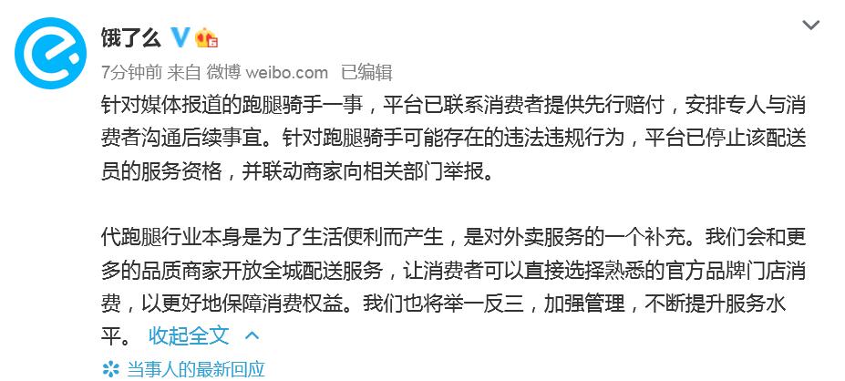 饿了么表示,针对媒体报道的跑腿骑手一事,平台已联系消费者提供先行赔付,安排专人与消费者沟通后续事宜。
