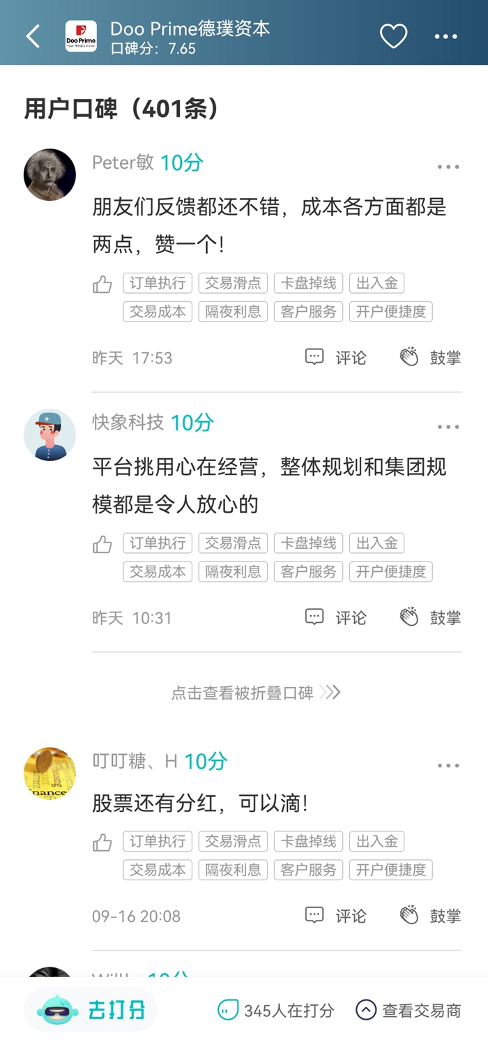 德璞近期在天网查的口碑非常不错,得到的口碑分都很高。“平台交易环境不错”、“交易成本比较稳定”、“平台出金速度快”等等,都是用户对其肯定。