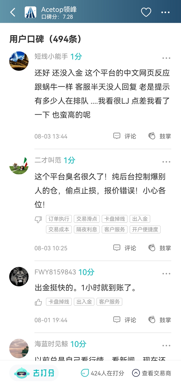 9月份以来,Acetop领峰收到了不少低分口碑:“有点消息波动就无法平仓”、“单子随意给你平掉,平台关闭交易账户”。随意平仓,问题很严重了。