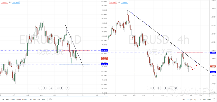 欧美天图:目前趋势继续处于在空头阶段中,并且受到上方水平压制带1.19871区域与下降趋势线的压制继续调整。由于空间幅度有限,从日内4小时级别,其价格在触及下方水平支撑带1.18697附近后处于弱势调整,适当关注价格回测上方压制区间再次受阻机会, 下方空头目标位置参考前期低点附近。