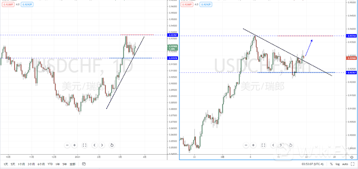 美瑞天图:短期价格在回测下方水平支撑带0.91978附近起稳,同时下方又有上升趋势线的支撑作用。整体格局目前继续保持在多头阶段中,从日内4小时级别,价格在回测支撑带后起稳上行突破下降趋势线的压制作用,短期可关注价格调整后的多头机会,上方区间目标位置参考0.93744附近。