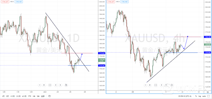 黄金天图:短期趋势继续上行回测关键位置附近,目前价格在1748.563附近有受阻迹象,下方水平支撑带在1715.467附近。从日内4小时级别,价格上行动能有所减弱,可适当关注价格测试1729.083附近的表现。如果起稳则继续关注多头机会,反之,将可能受阻下探。