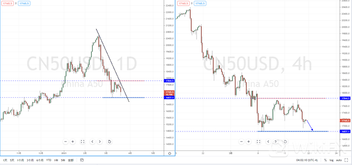 A50指数天图:目前趋势虽然处于在空头阶段中,上方有下井趋势线的压制作用。但短期价格在测试前期低点支撑带16837.1附近后止跌徘徊,从日内4小时级别,其趋势也处于在宽幅区间阶段中运行。适当价格再次测试下方关键支撑的表现,如果起稳其趋势将进入反弹阶段,但需要注意上方空间幅度。