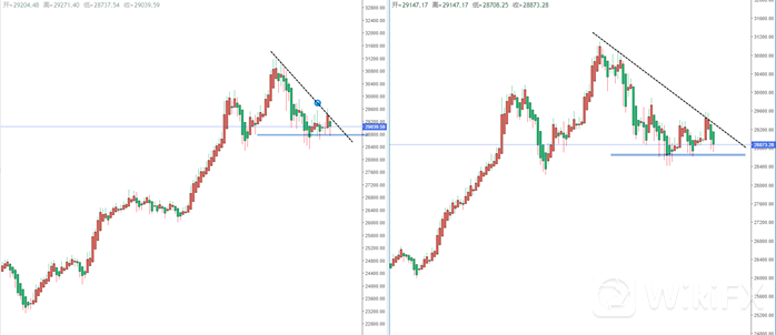 HK50:目前行情继续在支撑区域附近调整,上方仍然受到下降趋势线的压制作用。虽然趋势在下方水平支撑附近测试后起稳,但并未打开多头流向。从日内4小时级别,可适当关注价格调整后上行突破的多头机会,上方目标位置参考30696.19附近。