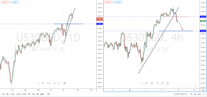 道琼斯指数:短期价格在继续上行冲击后开始走弱,并且有跌破上升趋势线的支撑作用。从日内4小时级别,其重要水平支撑带32773.2一带被坚决的跌破。近期趋势属于偏空,由于趋势空流向尚未形成,不宜追空行情。可关注价格回测调整后的空头机会,下方目标位置参考32134.2附近。