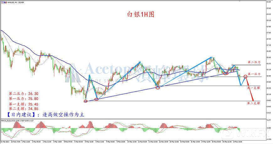 从上图白银1小时图来看,白银已经结束了自24.85—26.60的上涨行情,白银已经跌破了上升趋势线,并震荡下行,走势由多转空。从均线来看,K线在MA20和MA60之下,且双线发散向下,整体走势偏空。从指标MACD来看,空头动能柱开始逐步增强, DIFF和DEA在零轴附近出现死叉,说明白银有下跌需求,建议投资者可以尝试反弹至第一压力25.80附近布局空单。
