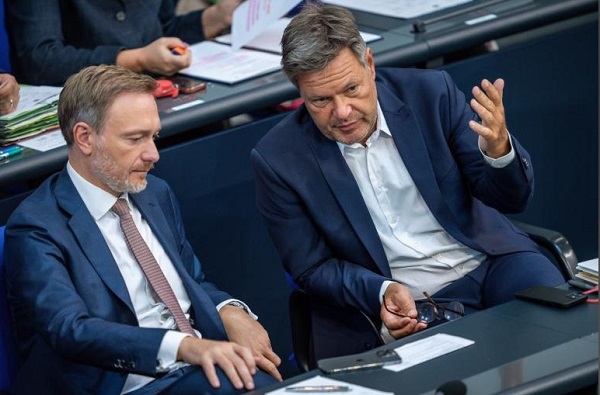 罗伯特·哈贝克(左)和克里斯蒂安·林德纳在联邦议院预算的一般性辩论中
