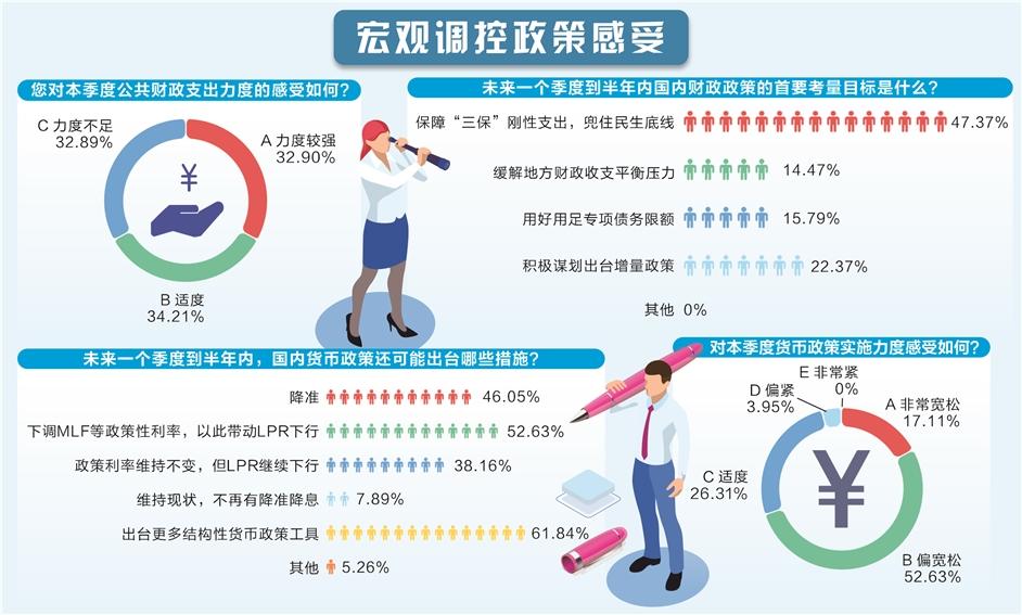 调查显示,仅7.89%的受访者认为在未来一个季度到半年内,货币政策将维持现状,不再开展降准、降息操作,反映出多数受访者对货币政策加大实施力度抱有期待。