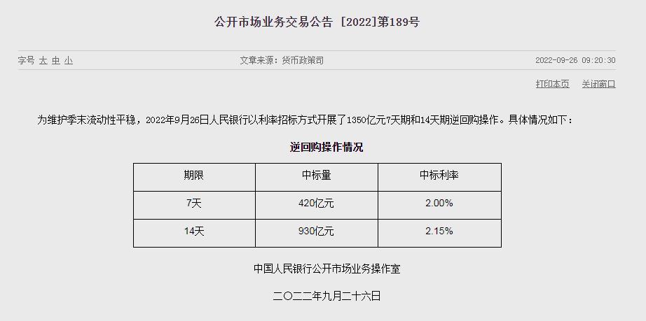 中新经纬9月26日电 中国央行网站消息,为维护季末流动性平稳,中国央行26日开展7天期420亿元和14天期930亿元逆回购操作,中标利率分别为2.0%、2.15%。