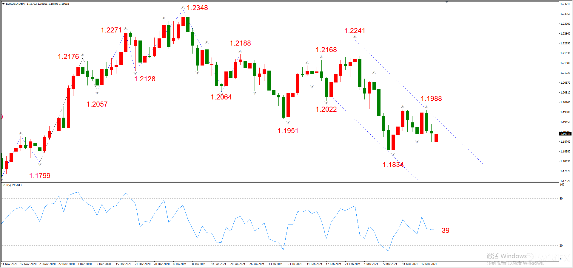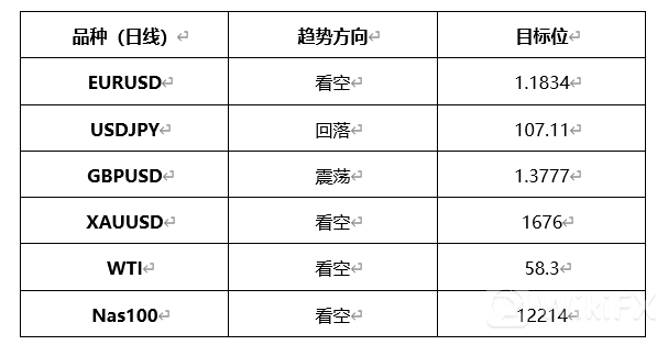 综合判断:空头趋势,反弹已经结束,即将迎来较大幅度下跌,短期目标位1.1834。长周期来看,美联储必将因为国债收益率的上行而提前收紧货币政策,欧元也将因此贬值。