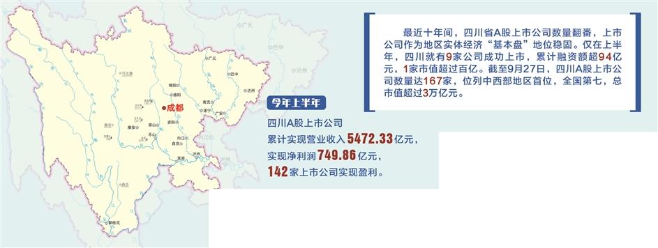 仅在上半年,四川就有9家公司成功上市,累计融资额超94亿元,1家市值超过百亿。截至9月27日,四川A股上市公司数量达167家,位列中西部地区首位、全国第七,总市值超过3万亿元。