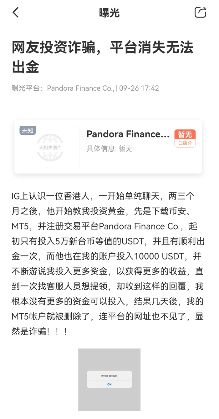 等到账户资金增加,网友尝试在Pandora Finance提现时,提现申请屡屡不被通过。咨询客服,客服以账户被冻结为由要网友缴纳“解冻金”。而此时的网友,已经没有更多资金缴“解冻金”了。此时平台开始玩失踪了,先是删除了曝光网友在Pandora Finance平台的账户,再然后连平台网址都无法打开了。网友这才意识到自己被骗了。