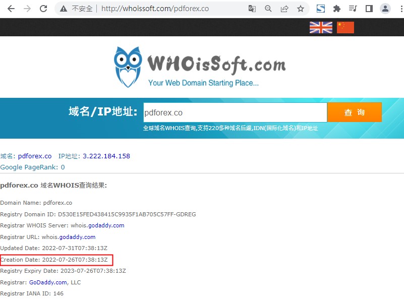 查询后天网查发现,Pandora Finance平台的官网www.pdforex.co域名极其新,成立仅仅2个月,可能比曝光网友认识诈骗者还要晚几天!