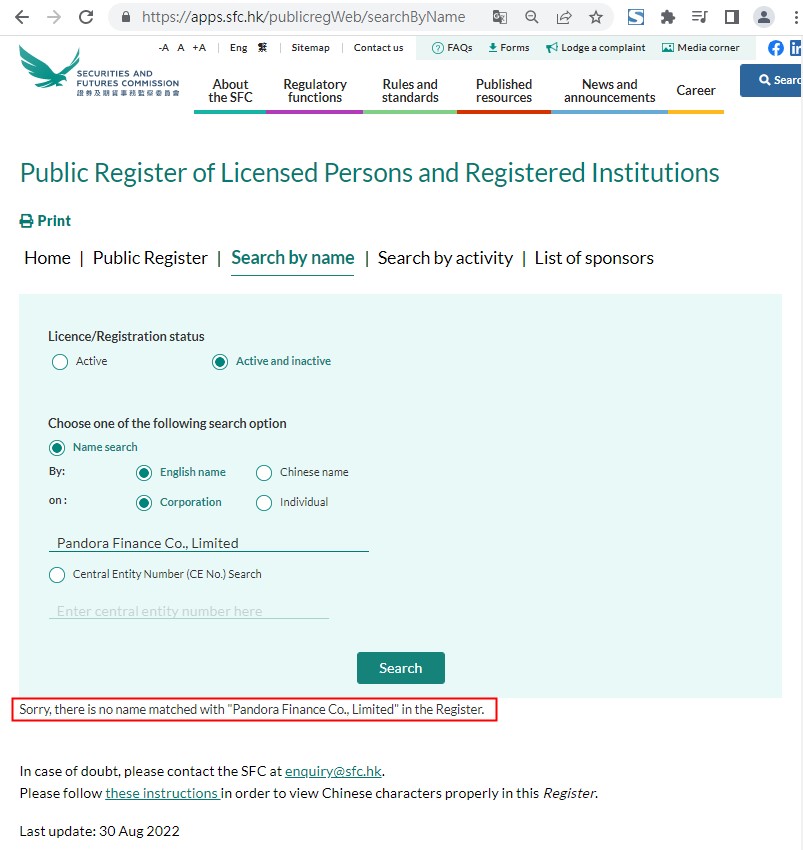 在香港工商页和SFC查询Pandora Financ相关信息,工商登记信息与公开信息符合;但在SFC却未找到与之相关的任何监管信息,这表明:Pandora Finance是一家无监管的黑平台,请各位投资者注意远离!