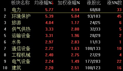 盘面上,行业板块近乎全涨,电力、环境保护、旅游、供气供热、运输设备、水务等板块涨幅居前,公共交通、化纤两板块下跌。