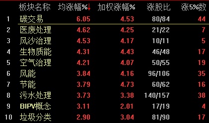 概念板块全线飘红,碳交易、风沙治理、医废处理、生物质能、空气治理、风能、节能等板块涨幅靠前。