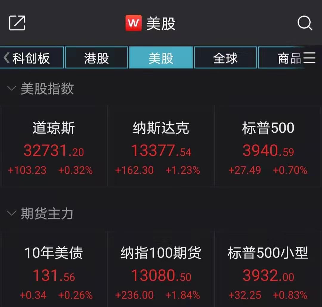 截至收盘,道指涨103.23点,涨幅0.32%,报32731.20点;纳指涨162.31点,涨幅1.23%,报13377.54点;标普500指数涨27.49点,涨幅0.70%,报3940.59点。