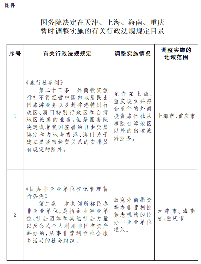 一、按照《国务院关于同意在天津、上海、海南、重庆开展服务业扩大开放综合试点的批复》(国函〔2021〕37号),同意自即日起至2024年4月8日,在相关省市暂时调整实施《旅行社条例》、《民办非企业单位登记管理暂行条例》的有关规定(目录附后)。