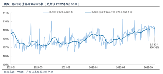 广发证券运用银行间分期限质押式回购交易额与银行间分期限质押式回购交易平均回购期限计算每日的待购回质押式回购余额,运用线性插值法将月末债券托管量填充为日度债券托管量,经测算,银行间债券市场杠杆率平均值周内持续下降,周五为周内最低点108.32%,周一为周内最高点109.47%。