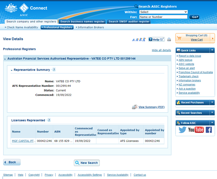 在瓦努阿图VFSC查询“Vatee Global Limited”,找到了对应的公司信息,监管号也与宣称无出入。在澳大利亚ASIC官网查询发现,Vatee Global Limited持有ASIC的AR牌照,且授权牌照具有外汇权限。